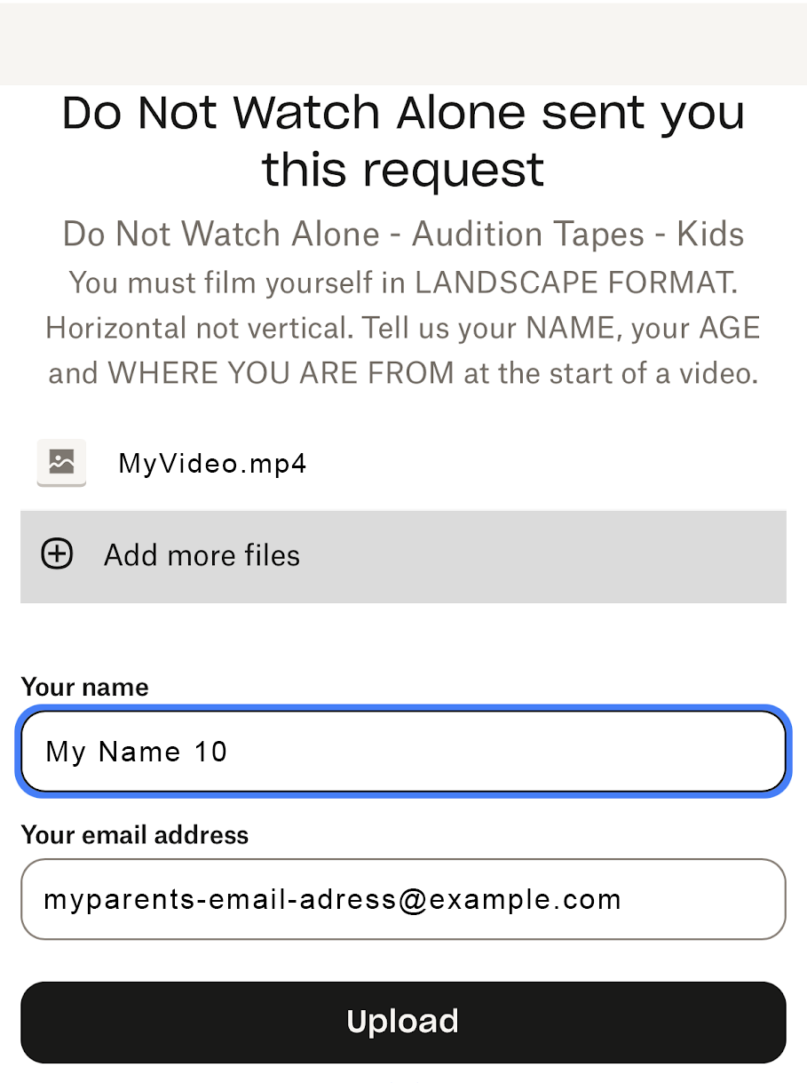 To upload your audition you will be redirected to an external file sharing website called DROPBOX where you will be asked to add you name (please also include your age) and a parent's or guardian's email address. The pages will look like this…